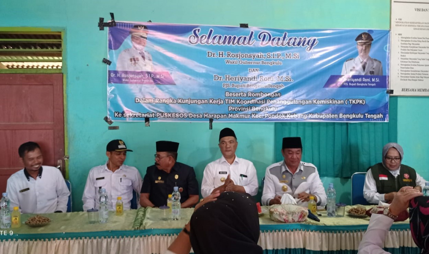 Bengkulu Tengah: Ketua Tim Koordinasi Penanggulangan Kemiskinan Provinsi Bengkulu Dr.H. Rosjonsyah,S.I.P.M.Si hari ini, Rabu 14 September 2022 melakukan kunjungan kerja ke Pusat Kesejahteraan Sosial (PUSKESOS) Desa Harapan Makmur. dalam kesempatan ini Wakil Gubernur Bengkulu di dampingi Kepala OPD Provinsi dan Penjabat Bupati Bengkulu Tengah dan jajaran. rombongan tiba di Desa Harapan makmur sekitar pukul 11.45 WIB dan diterima dengan tari penyambutan.